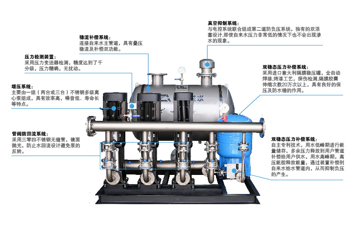 箱式無負壓供水設備可直接與供水管網鏈接,確保供水管網不產生負壓,在高峰時將密閉水箱的水增壓可補償供水管網供水量的不足,滿足用戶用水需要的設備。主要由密閉水箱、主泵機組、變頻控制柜、增壓裝置、引水裝置、穩(wěn)流罐、無負壓流量控制器、保壓裝置及壓力傳感器等組成。