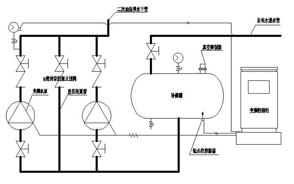 自來(lái)水管網(wǎng)的水進(jìn)入穩(wěn)流流罐,罐內(nèi)空氣從真空消除器排出,待水充滿后,真空消除器自動(dòng)關(guān)閉。當(dāng)自來(lái)水管網(wǎng)壓力能夠滿足用水要求時(shí),系統(tǒng)由旁通止回閥向用水管網(wǎng)直接供水;當(dāng)自來(lái)水管網(wǎng)壓力不能滿足用水要求時(shí),系統(tǒng)壓力信號(hào)由遠(yuǎn)傳壓力表反饋給變頻控制器,水泵運(yùn)行,并根據(jù)用水量的大小自動(dòng)調(diào)節(jié)轉(zhuǎn)速恒壓供水,若運(yùn)轉(zhuǎn)水泵達(dá)到工頻轉(zhuǎn)速時(shí),則啟動(dòng)另一臺(tái)水泵變頻運(yùn)轉(zhuǎn)。水泵供水時(shí),若自來(lái)水管網(wǎng)的水量大于水泵流量,系統(tǒng)保持正常供水:用水高峰時(shí),若自來(lái)水管網(wǎng)水量小于小泵流量量,穩(wěn)流罐內(nèi)的水作為補(bǔ)充水源仍然能正常供水,此時(shí),空氣由真空消除器進(jìn)入穩(wěn)流罐,罐內(nèi)真空遭到破壞,確保了自來(lái)水管網(wǎng)不產(chǎn)生負(fù)壓,用水高峰過(guò)后,系統(tǒng)又恢復(fù)到正常供水狀態(tài)。當(dāng)自來(lái)水管網(wǎng)停水,造成穩(wěn)流罐液位不斷下降,液位探測(cè)器將信號(hào)反饋給變頻控制器,水泵自動(dòng)停機(jī),以保護(hù)水泵機(jī)組。夜間小流量供水且自來(lái)水管網(wǎng)壓力不能滿足要求時(shí),氣壓罐可以貯存并釋放能量,避免了水泵頻繁啟動(dòng)優(yōu)點(diǎn):1、無(wú)污染:沒(méi)有池子和盛水的箱子,從來(lái)水全嚴(yán)密封閉形式運(yùn)行,完全沒(méi)有二次污染。